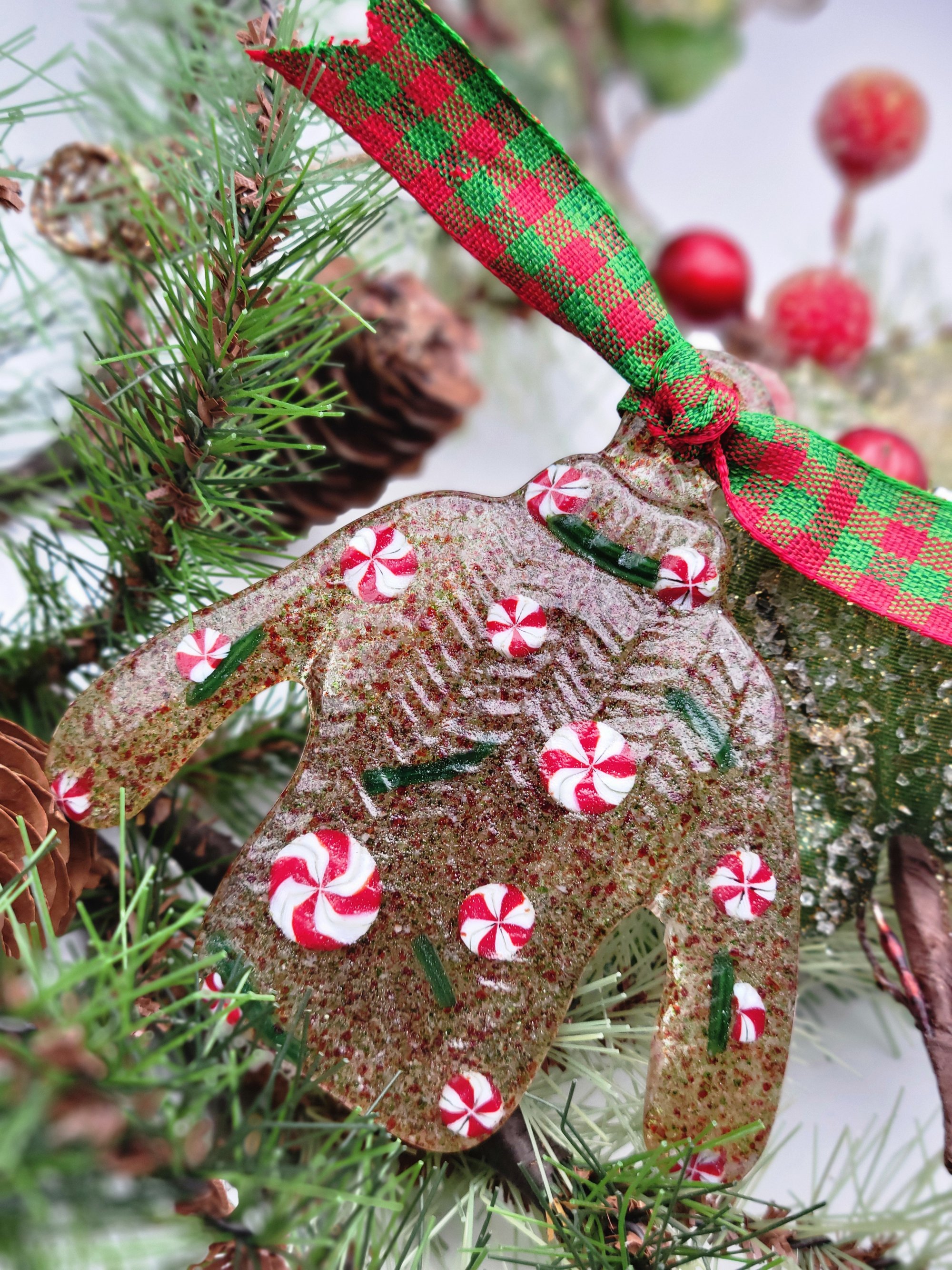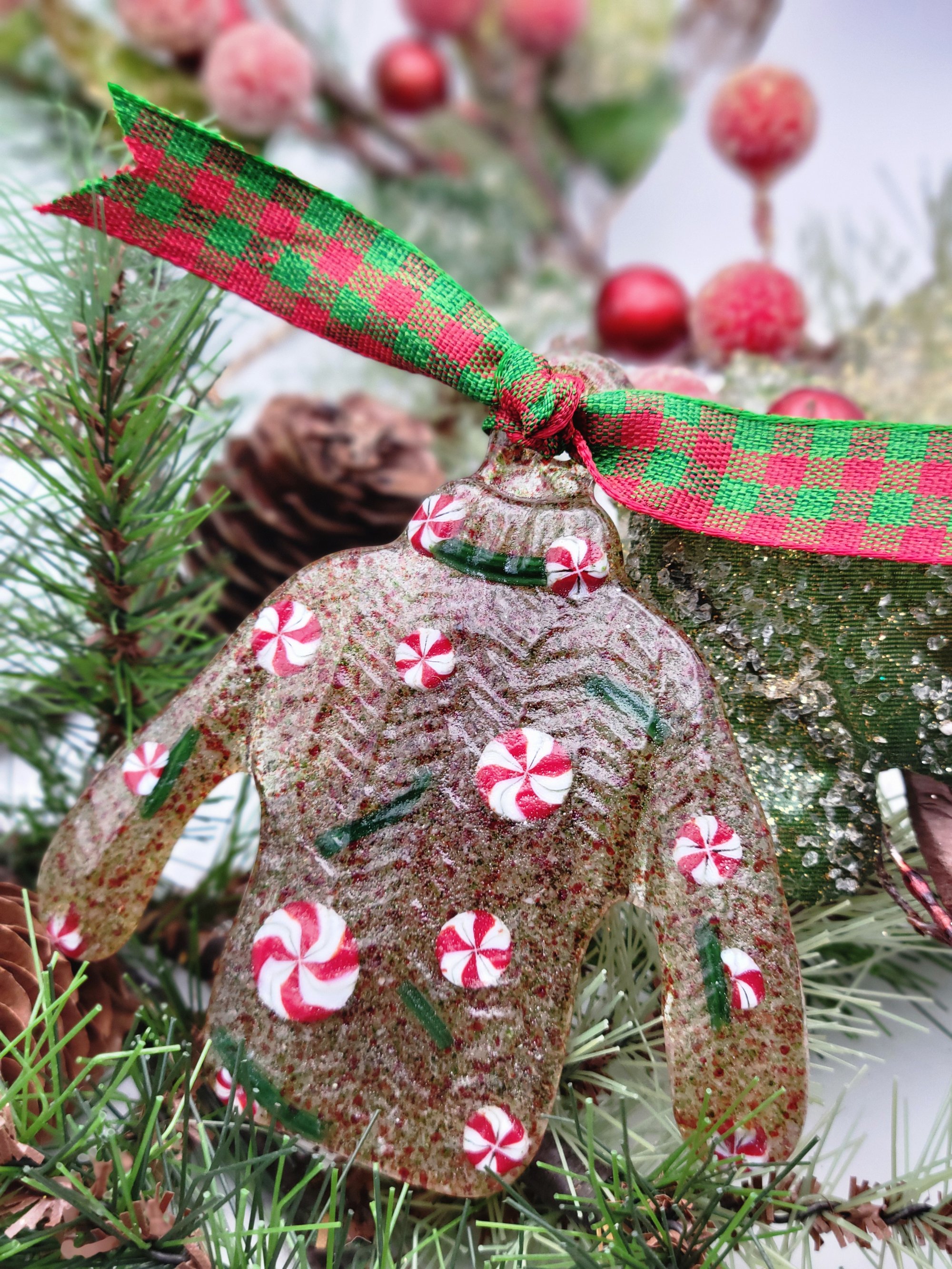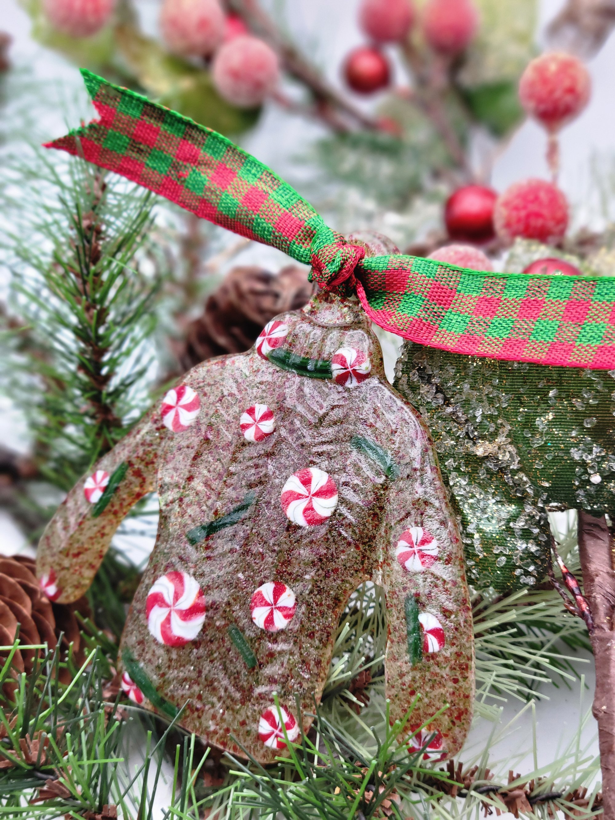 First, I hand-cut any decorative elements for the design, such as candy canes, snowflakes, or holly. These elements are then carefully placed into a custom mold, followed by several layers of glass. The piece is then fired in my home studio kiln to fuse all the elements together. Finally, each ornament is completed with a colorful ribbon hanger, ready to hang on the tree in its new home!