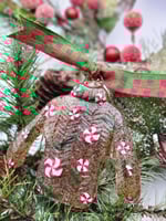 Every ornament is a one-of-a-kind piece with slight variations in size, generally measuring around 3.5" tall x 3.5" wide.