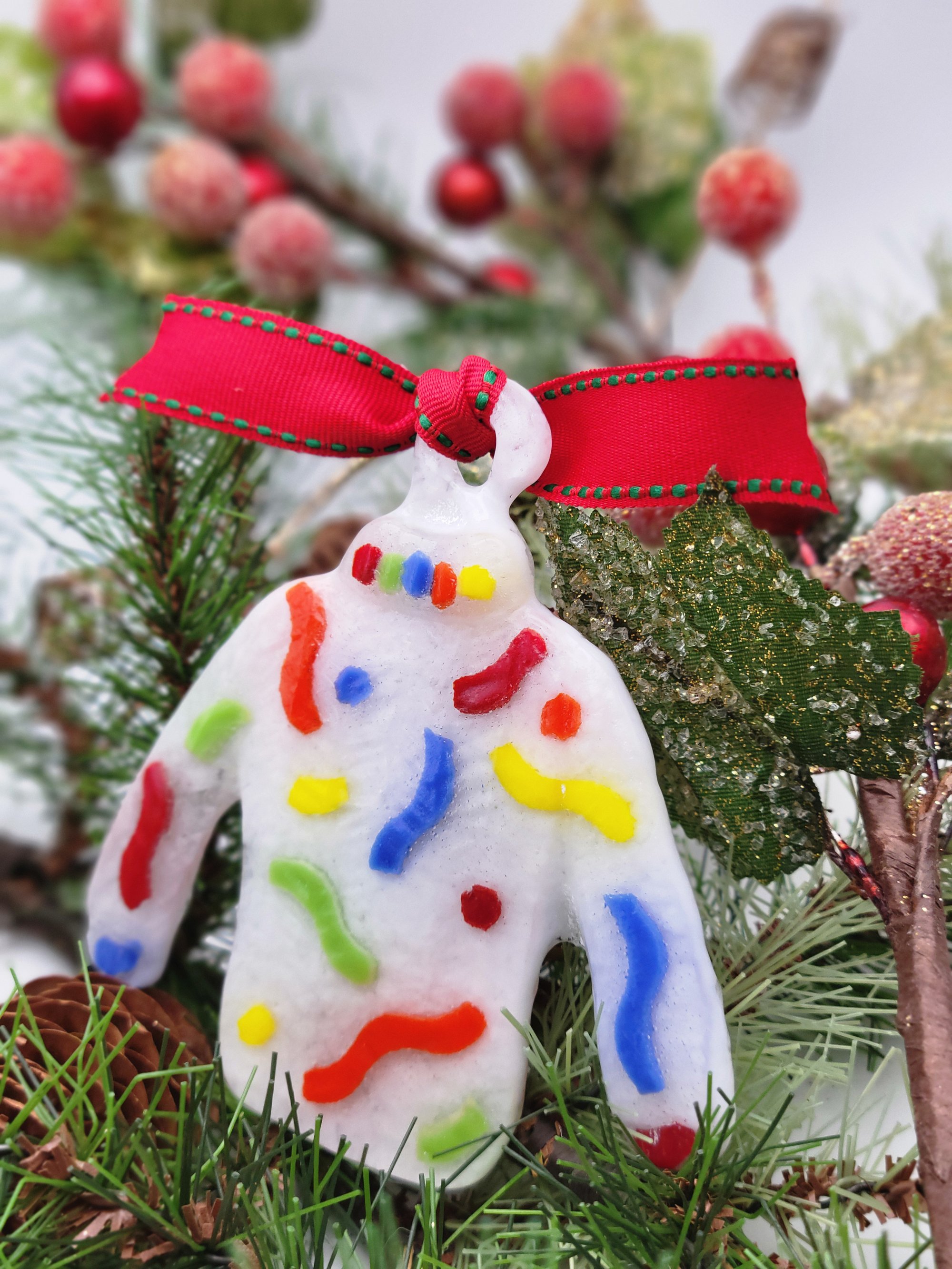 First, I hand-cut any decorative elements for the design, such as candy canes, snowflakes, or holly. These elements are then carefully placed into a custom mold, followed by several layers of glass. The piece is then fired in my home studio kiln to fuse all the elements together. Finally, each ornament is completed with a colorful ribbon hanger, ready to hang on the tree in its new home!