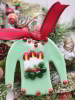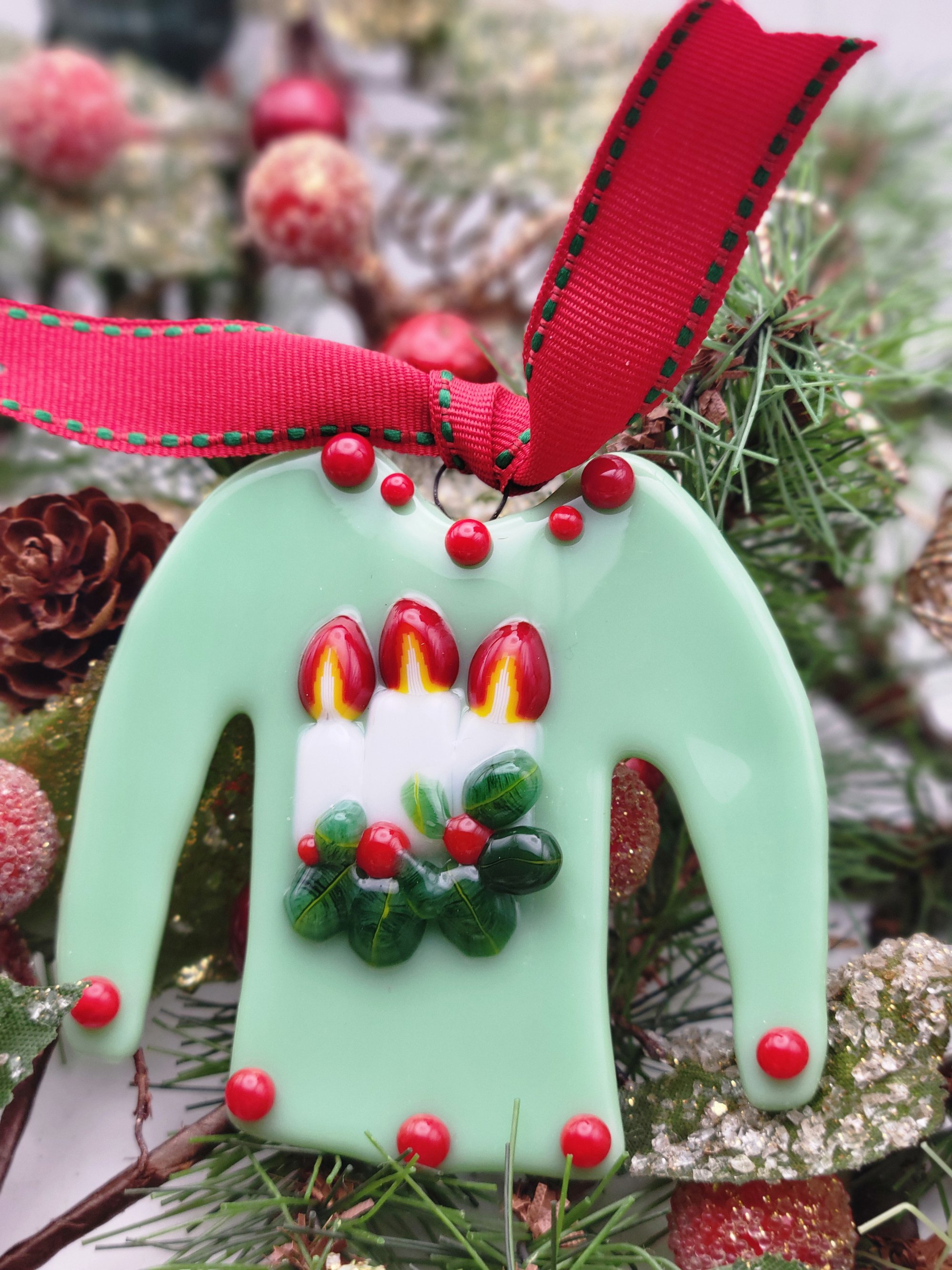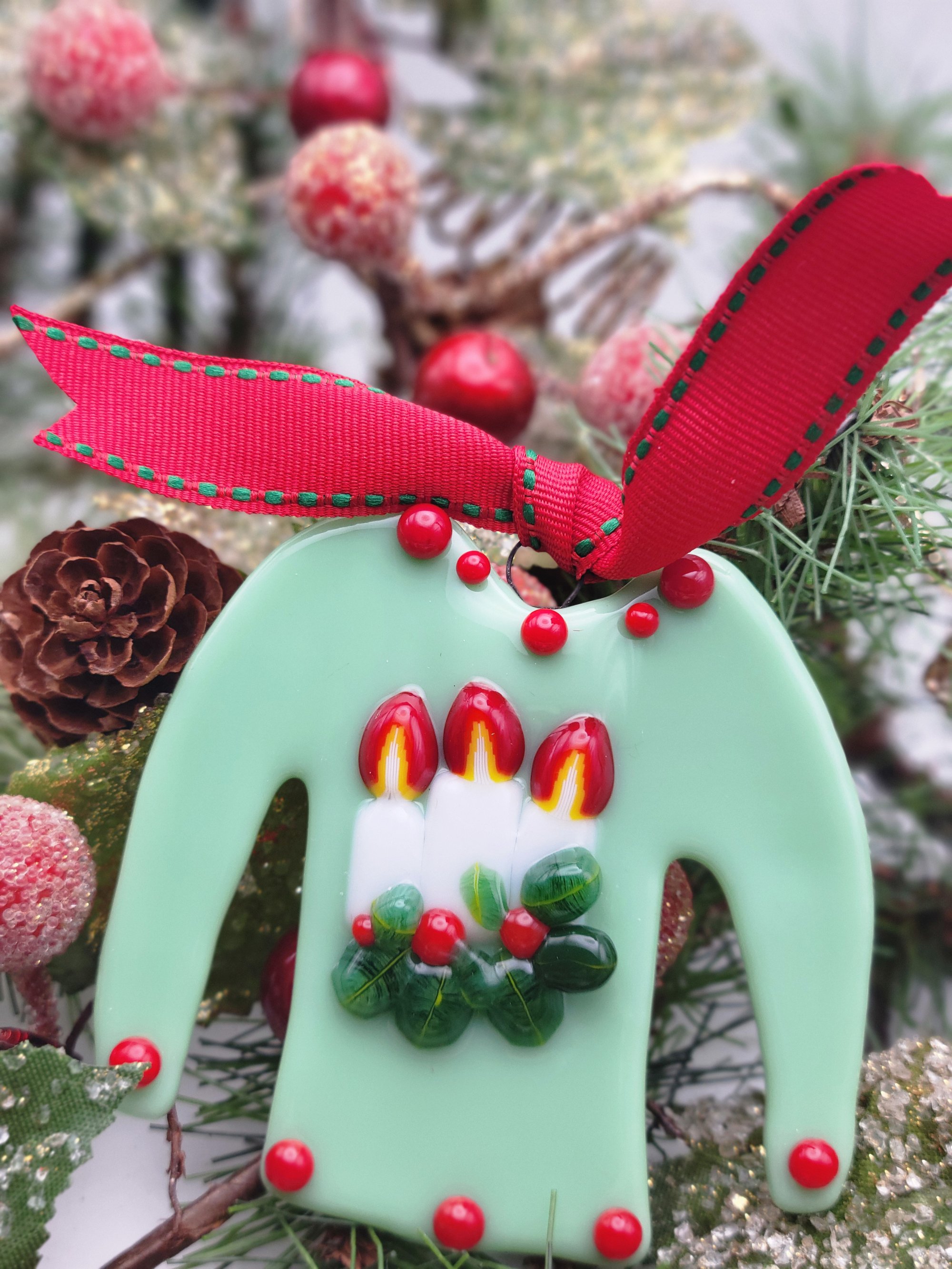 First, I hand-cut the body shape of the sweater from various colors of opaque glass. Then, I cut and add the adornments to each piece, which is fired in my home studio kiln to fuse all the elements together. I sometimes add additional details using enamel paints, and the sweater is fired once more to ensure the paint is permanent. Finally, each ornament is completed with a colorful ribbon hanger, ready to hang on the tree in its new home!