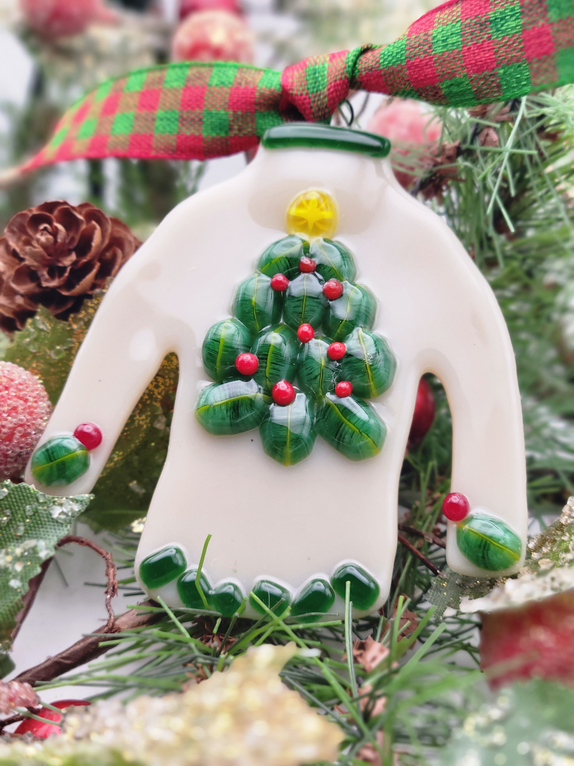 First, I hand-cut the body shape of the sweater from various colors of opaque glass. Then, I cut and add the adornments to each piece, which is fired in my home studio kiln to fuse all the elements together. I sometimes add additional details using enamel paints, and the sweater is fired once more to ensure the paint is permanent. Finally, each ornament is completed with a colorful ribbon hanger, ready to hang on the tree in its new home!