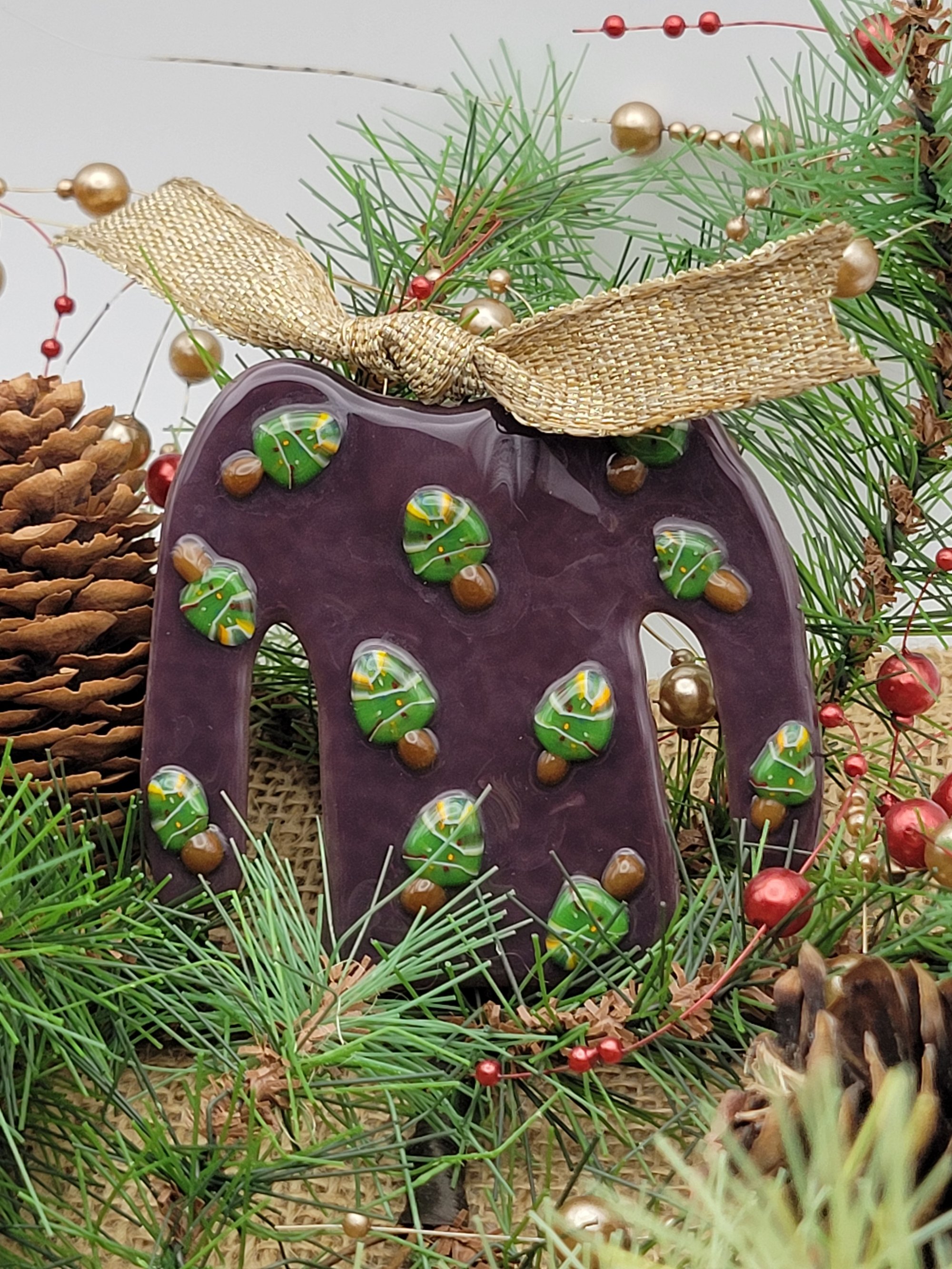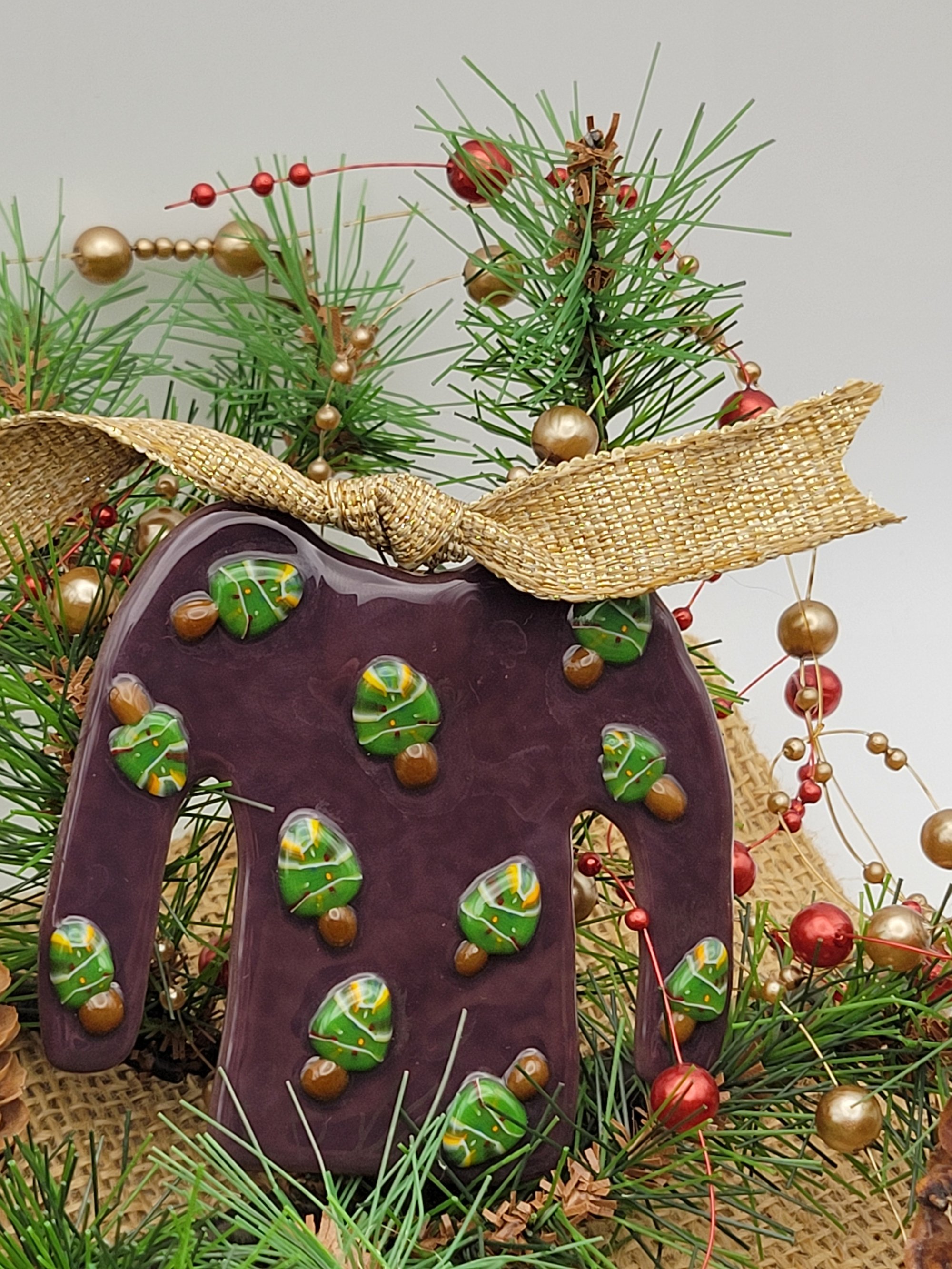First, I hand-cut the body shape of the sweater from various colors of opaque glass. Then, I cut and add the adornments to each piece, which is fired in my home studio kiln to fuse all the elements together. I sometimes add additional details using enamel paints, and the sweater is fired once more to ensure the paint is permanent. Finally, each ornament is completed with a colorful ribbon hanger, ready to hang on the tree in its new home!