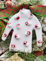 First, I hand-cut the body shape of the sweater from various colors of opaque glass. Then, I cut and add the adornments to each piece, which is fired in my home studio kiln to fuse all the elements together. I sometimes add additional details using enamel paints, and the sweater is fired once more to ensure the paint is permanent. Finally, each ornament is completed with a colorful ribbon hanger, ready to hang on the tree in its new home!