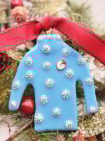 First, I hand-cut the body shape of the sweater from various colors of opaque glass. Then, I cut and add the adornments to each piece, which is fired in my home studio kiln to fuse all the elements together. I sometimes add additional details using enamel paints, and the sweater is fired once more to ensure the paint is permanent. Finally, each ornament is completed with a colorful ribbon hanger, ready to hang on the tree in its new home!