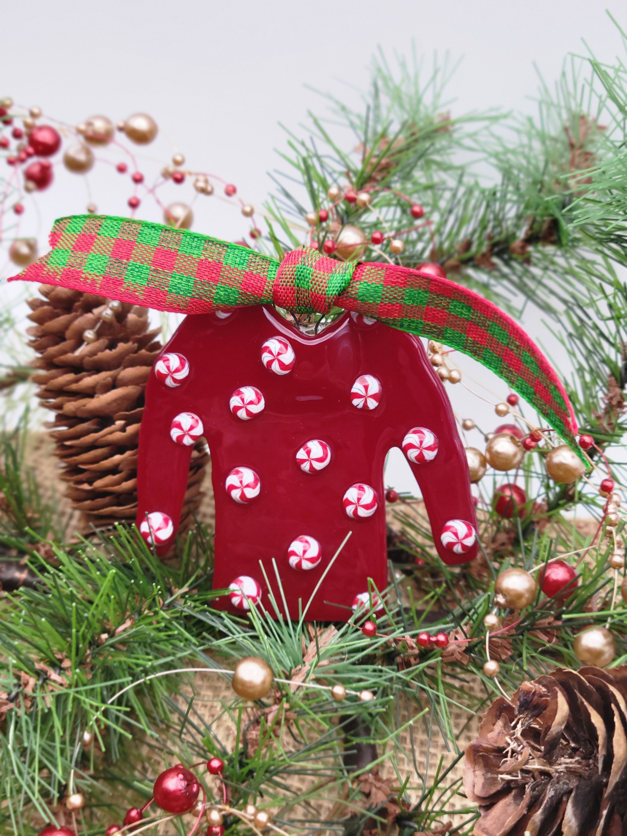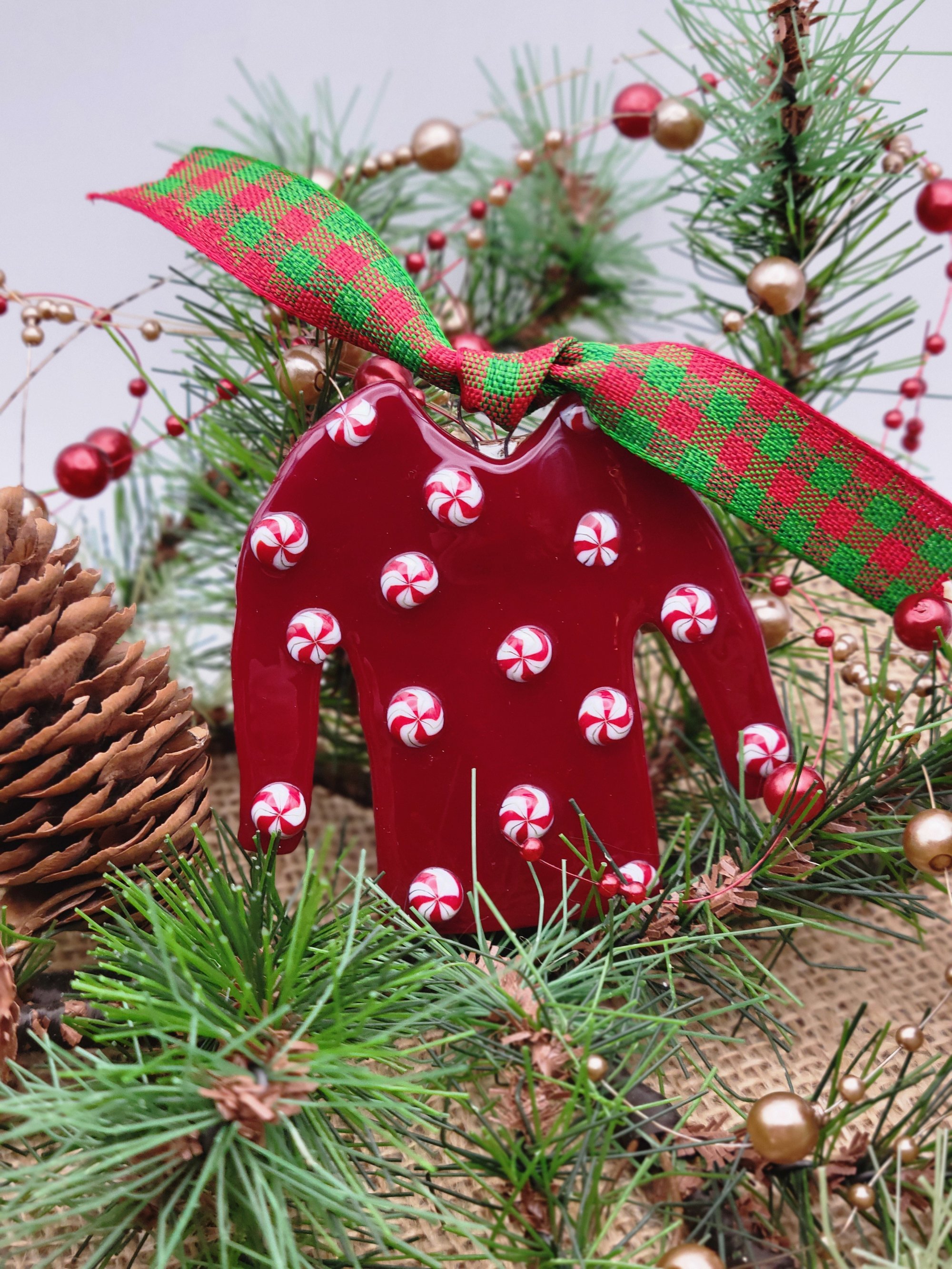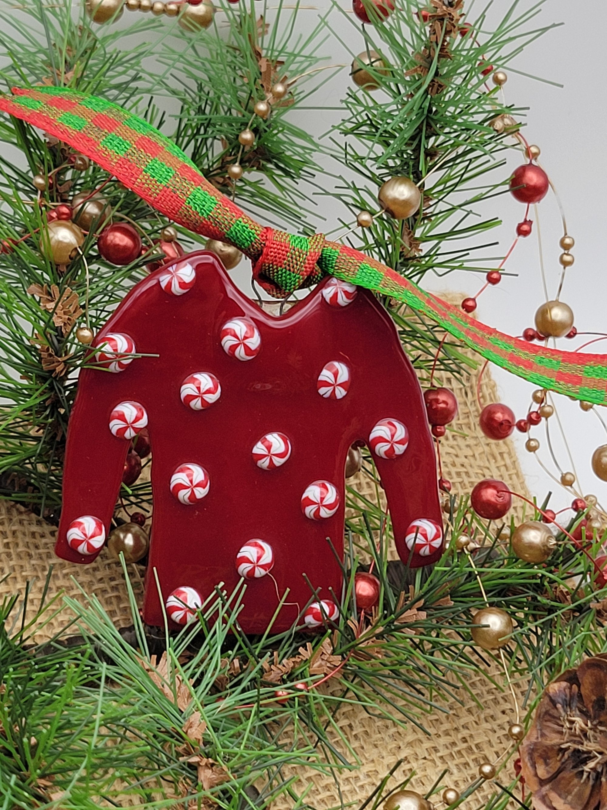 First, I hand-cut the body shape of the sweater from various colors of opaque glass. Then, I cut and add the adornments to each piece, which is fired in my home studio kiln to fuse all the elements together. I sometimes add additional details using enamel paints, and the sweater is fired once more to ensure the paint is permanent. Finally, each ornament is completed with a colorful ribbon hanger, ready to hang on the tree in its new home!