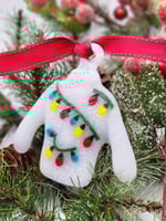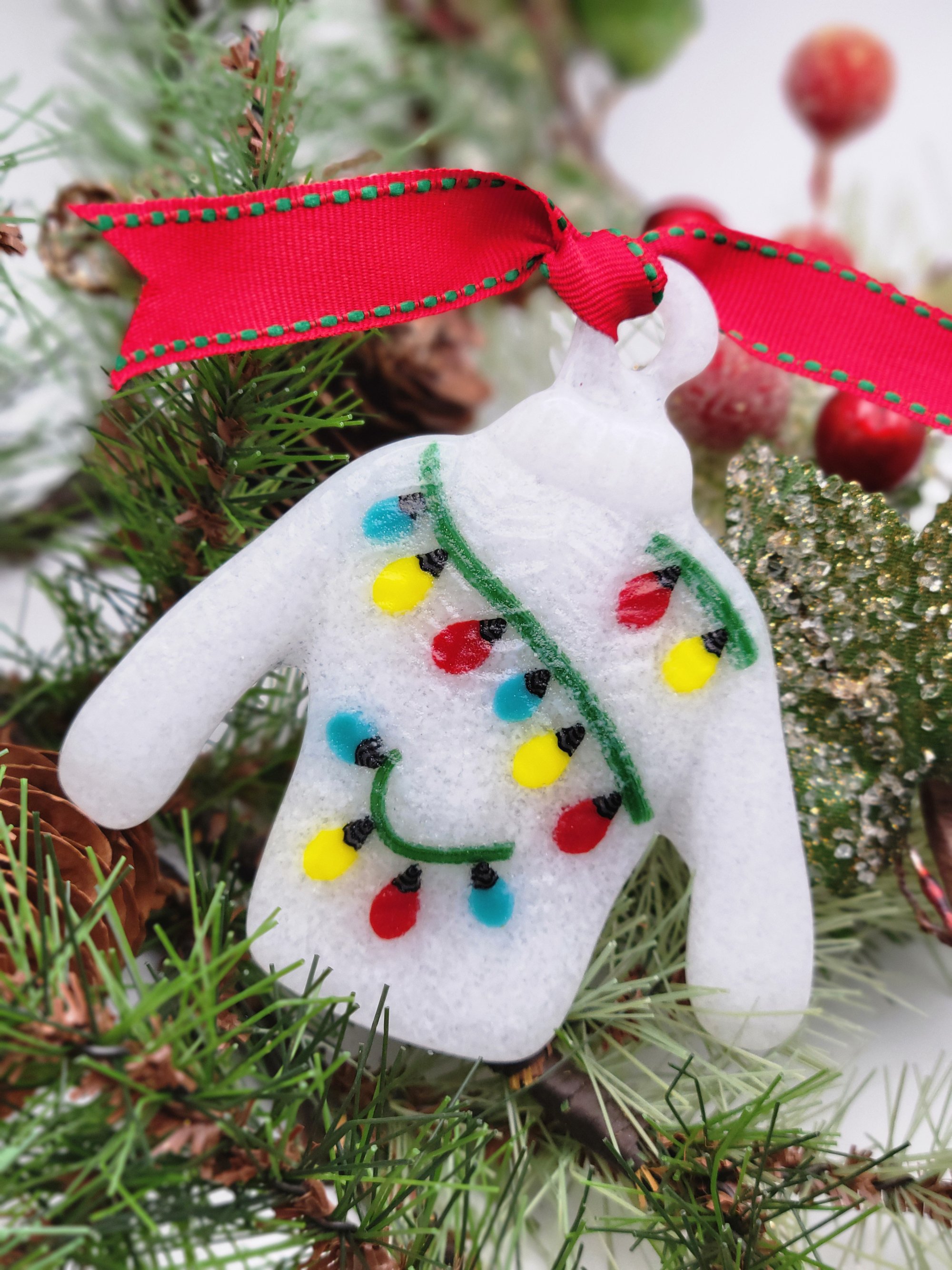 First, I hand-cut any decorative elements for the design, such as candy canes, snowflakes, or holly. These elements are then carefully placed into a custom mold, followed by several layers of glass. The piece is then fired in my home studio kiln to fuse all the elements together. Finally, each ornament is completed with a colorful ribbon hanger, ready to hang on the tree in its new home!