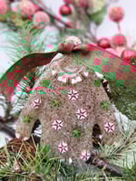 Every ornament is a one-of-a-kind piece with slight variations in size, generally measuring around 3.5" tall x 3.5" wide.