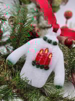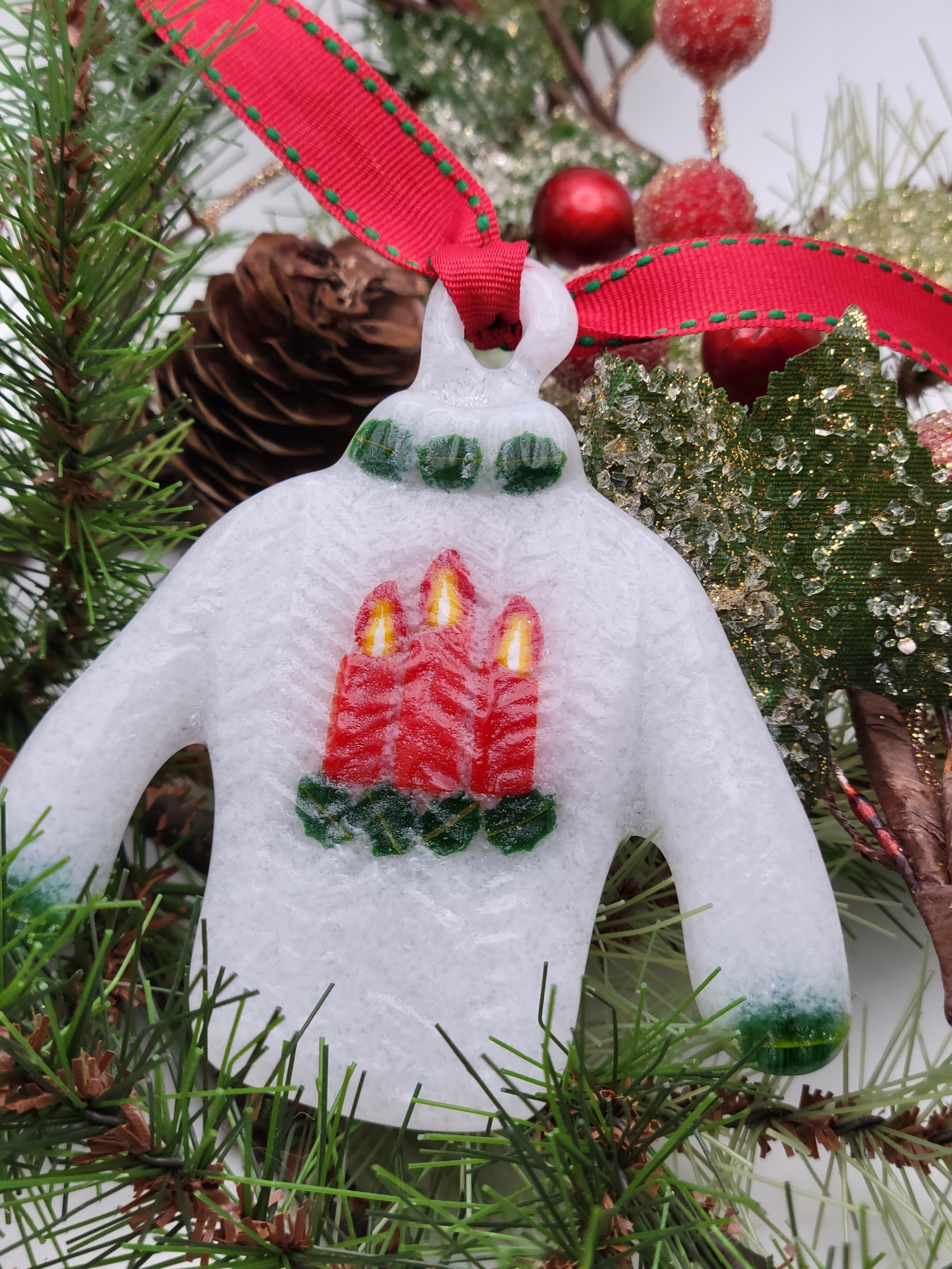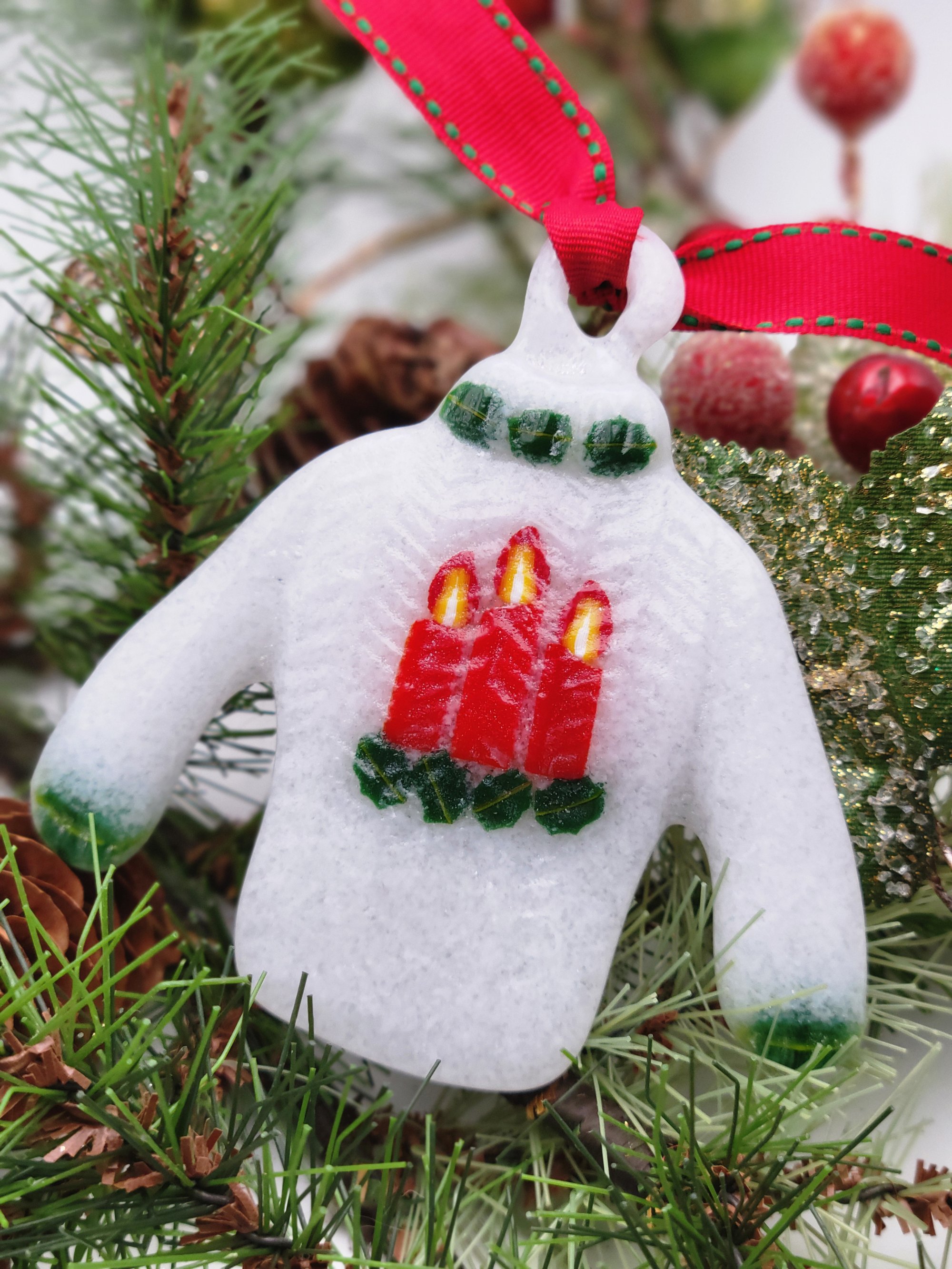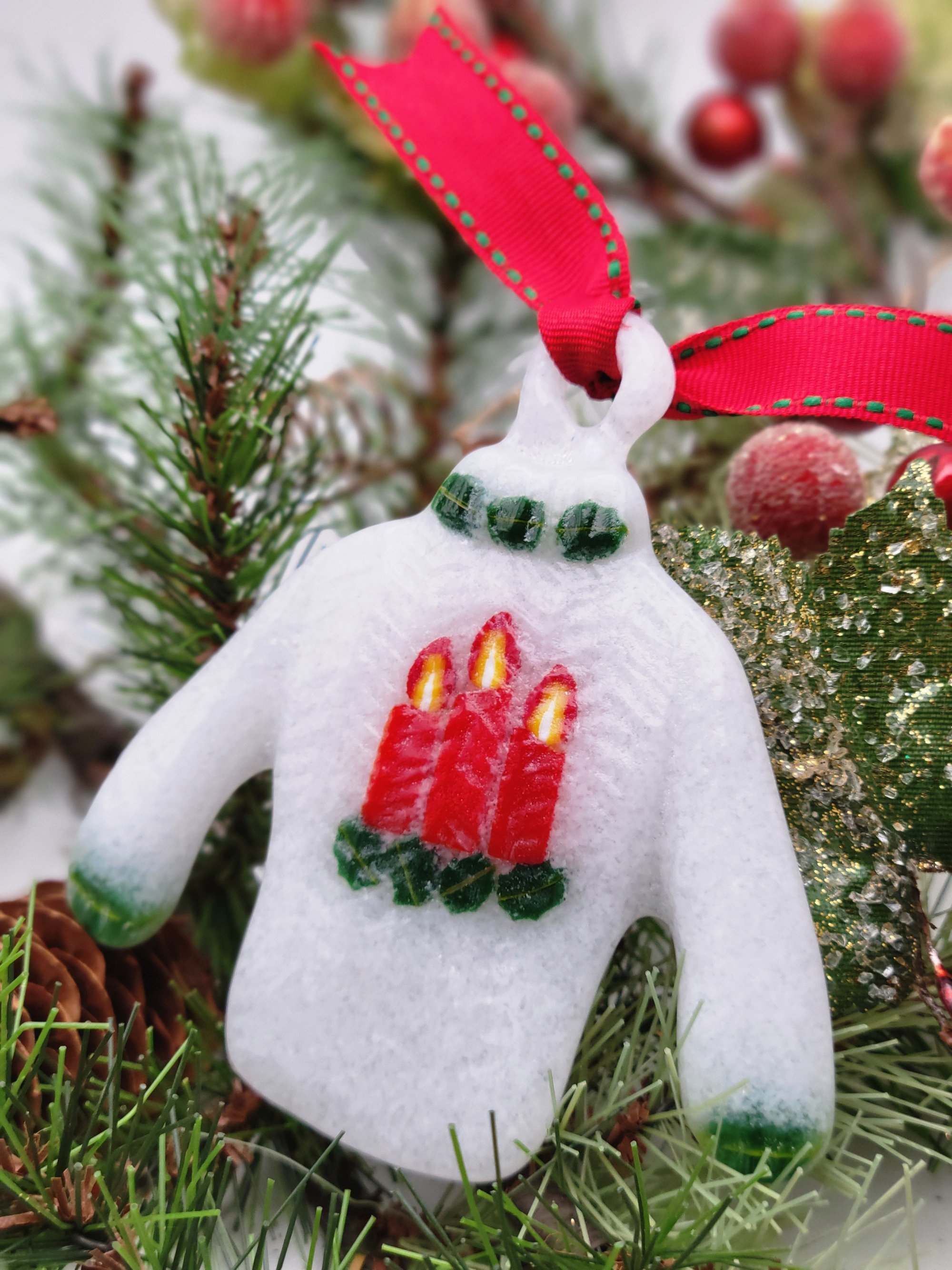 First, I hand-cut any decorative elements for the design, such as candy canes, snowflakes, or holly. These elements are then carefully placed into a custom mold, followed by several layers of glass. The piece is then fired in my home studio kiln to fuse all the elements together. Finally, each ornament is completed with a colorful ribbon hanger, ready to hang on the tree in its new home!