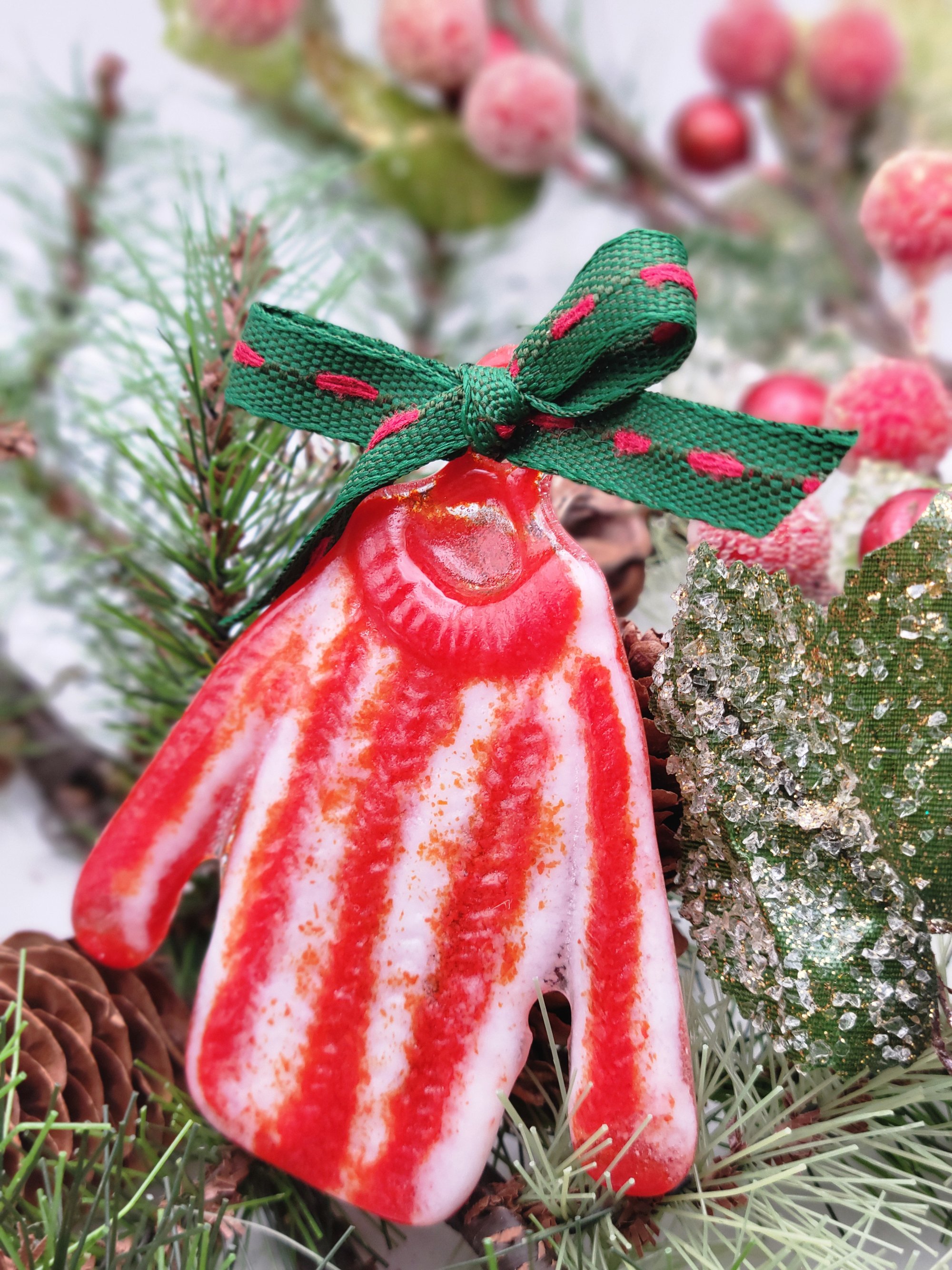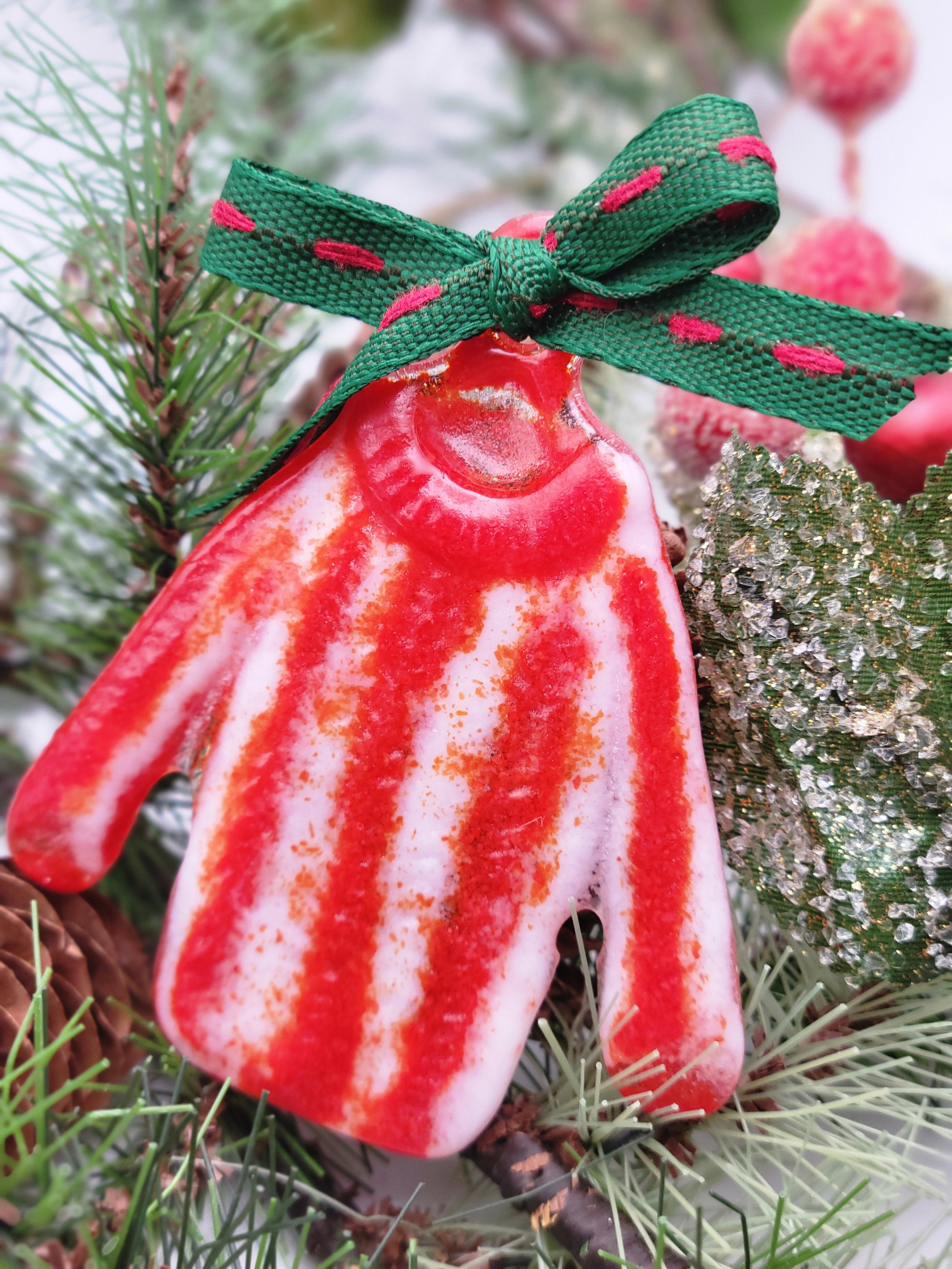 First, I hand-cut any decorative elements for the design, such as candy canes, snowflakes, or holly. These elements are then carefully placed into a custom mold, followed by several layers of glass. The piece is then fired in my home studio kiln to fuse all the elements together. Finally, each ornament is completed with a colorful ribbon hanger, ready to hang on the tree in its new home!