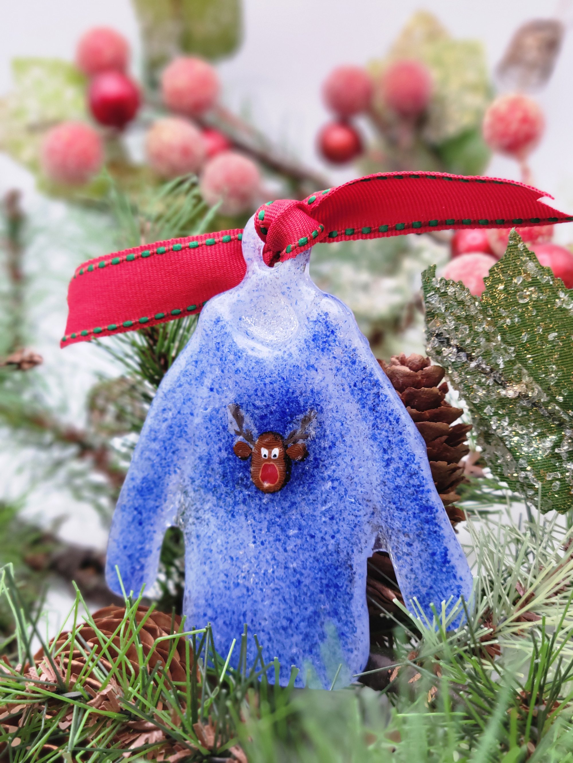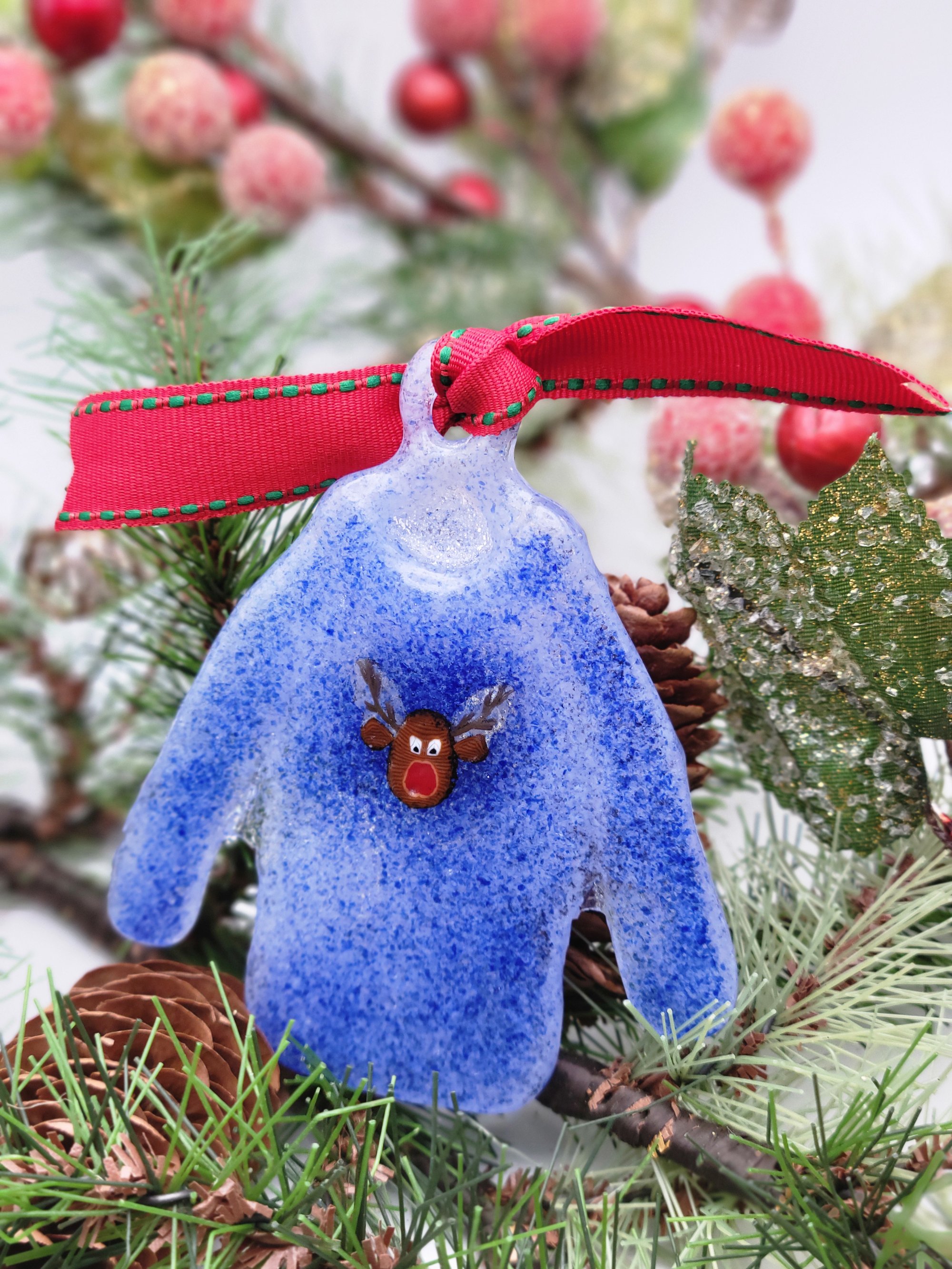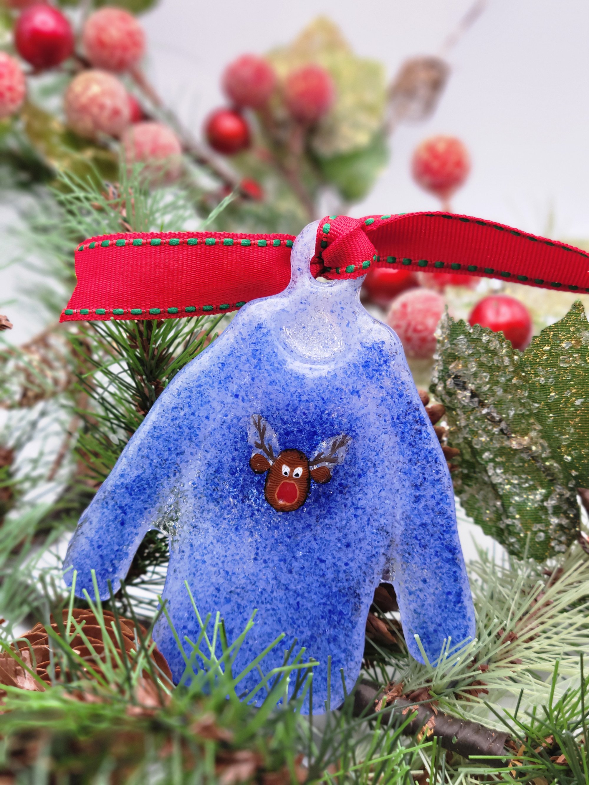 First, I hand-cut any decorative elements for the design, such as candy canes, snowflakes, or holly. These elements are then carefully placed into a custom mold, followed by several layers of glass. The piece is then fired in my home studio kiln to fuse all the elements together. Finally, each ornament is completed with a colorful ribbon hanger, ready to hang on the tree in its new home!